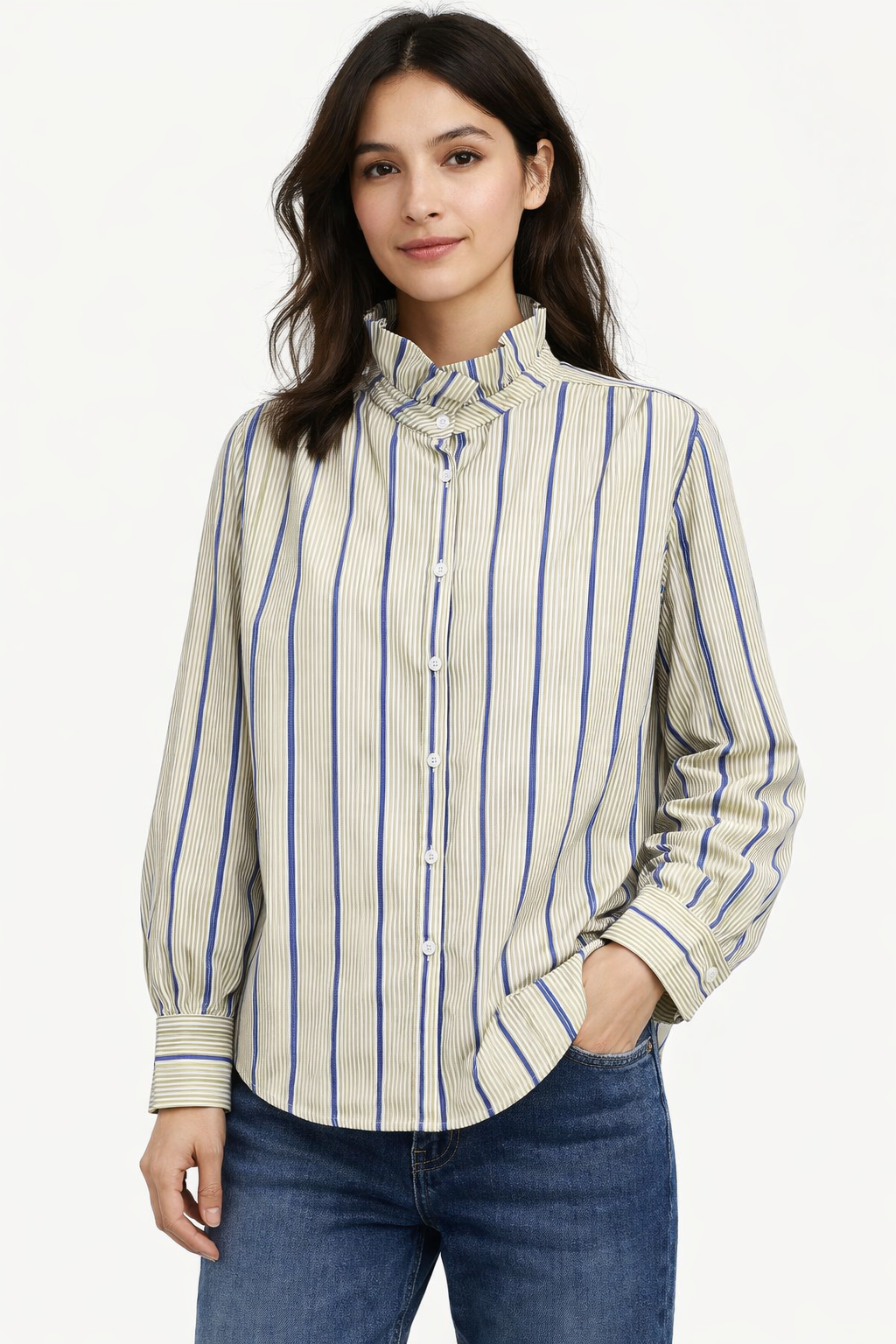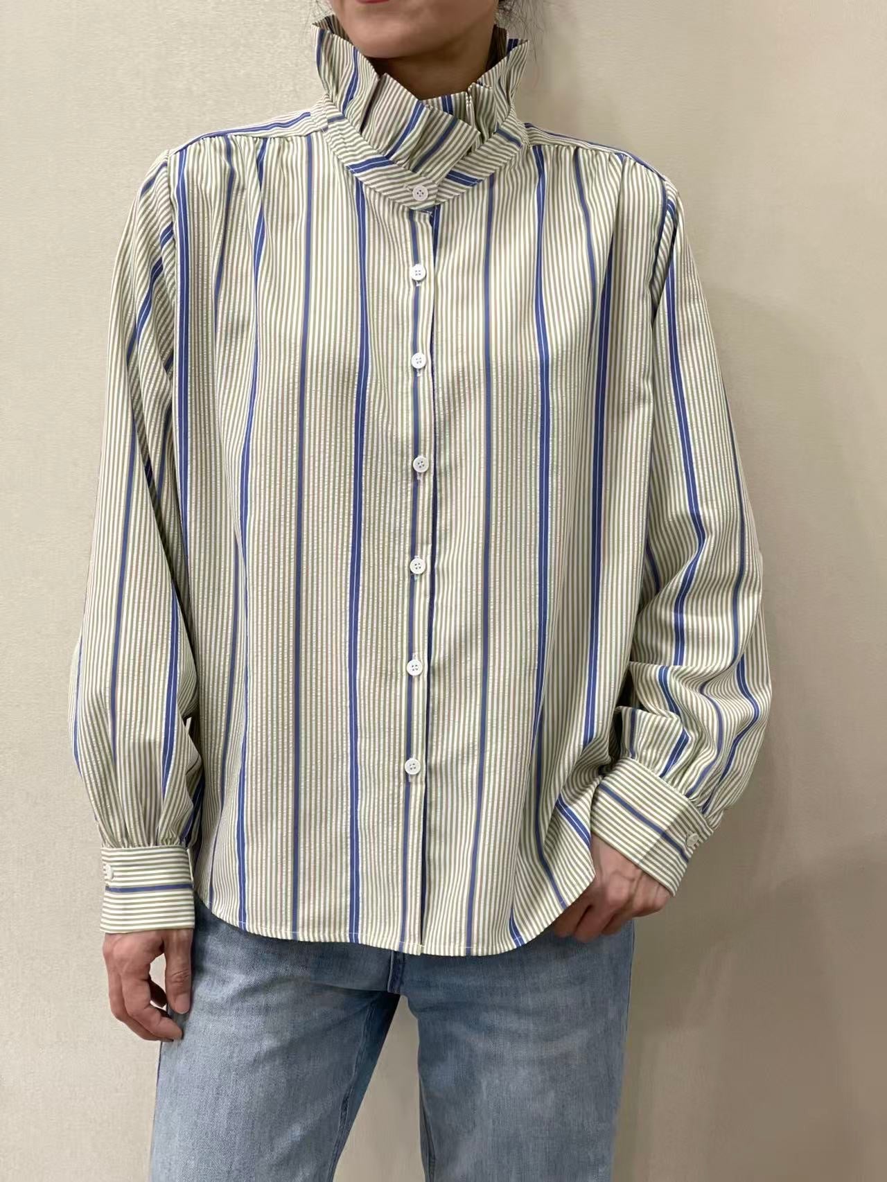 Blouse à col volanté et rayures bleues et vertes.