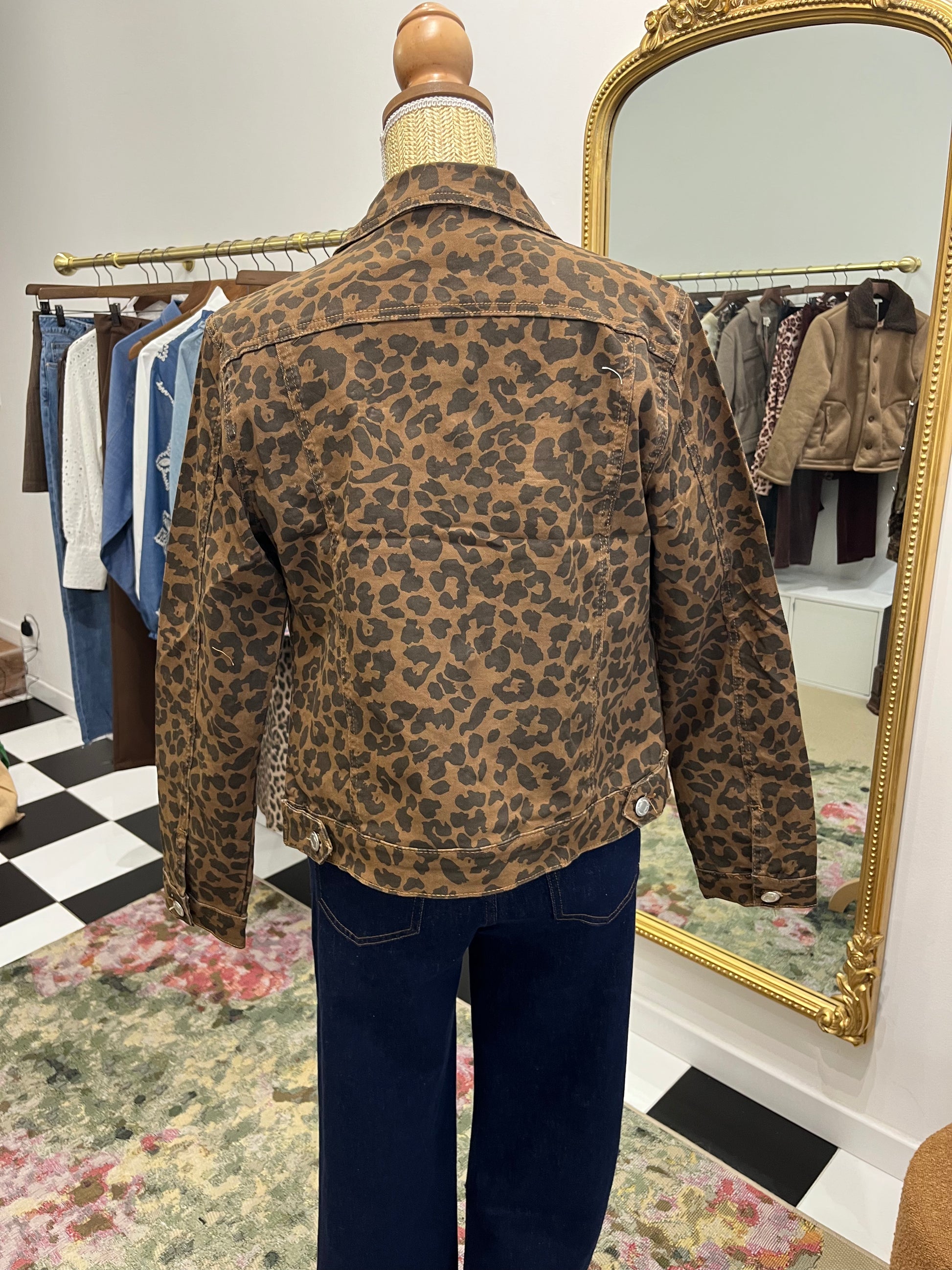 Blouson en jean stretch imprimé léopard, coupe large.