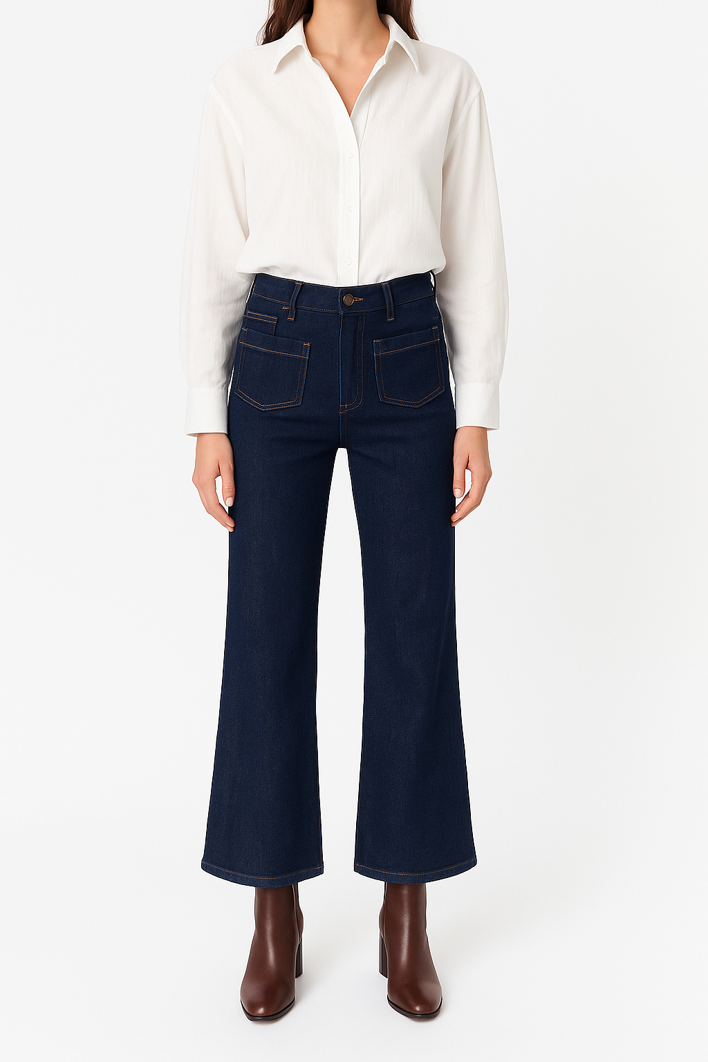 Jeans coupe wide large avec poches frontales. Taille haute passant pour ceinture, fermeture zip et boutons.